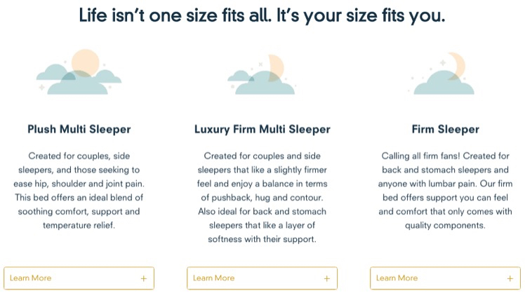 We overhauled the entire site, but the most important and fundamental shift was flipping the shopping experience on it’s head. While other DTCs assume your shopping experience starts with size, price and components, we recognizing our customers wanted to find a mattress based on how they sleep. To assist them, we designed a simple interface to help them discover the mattress that is right for them.